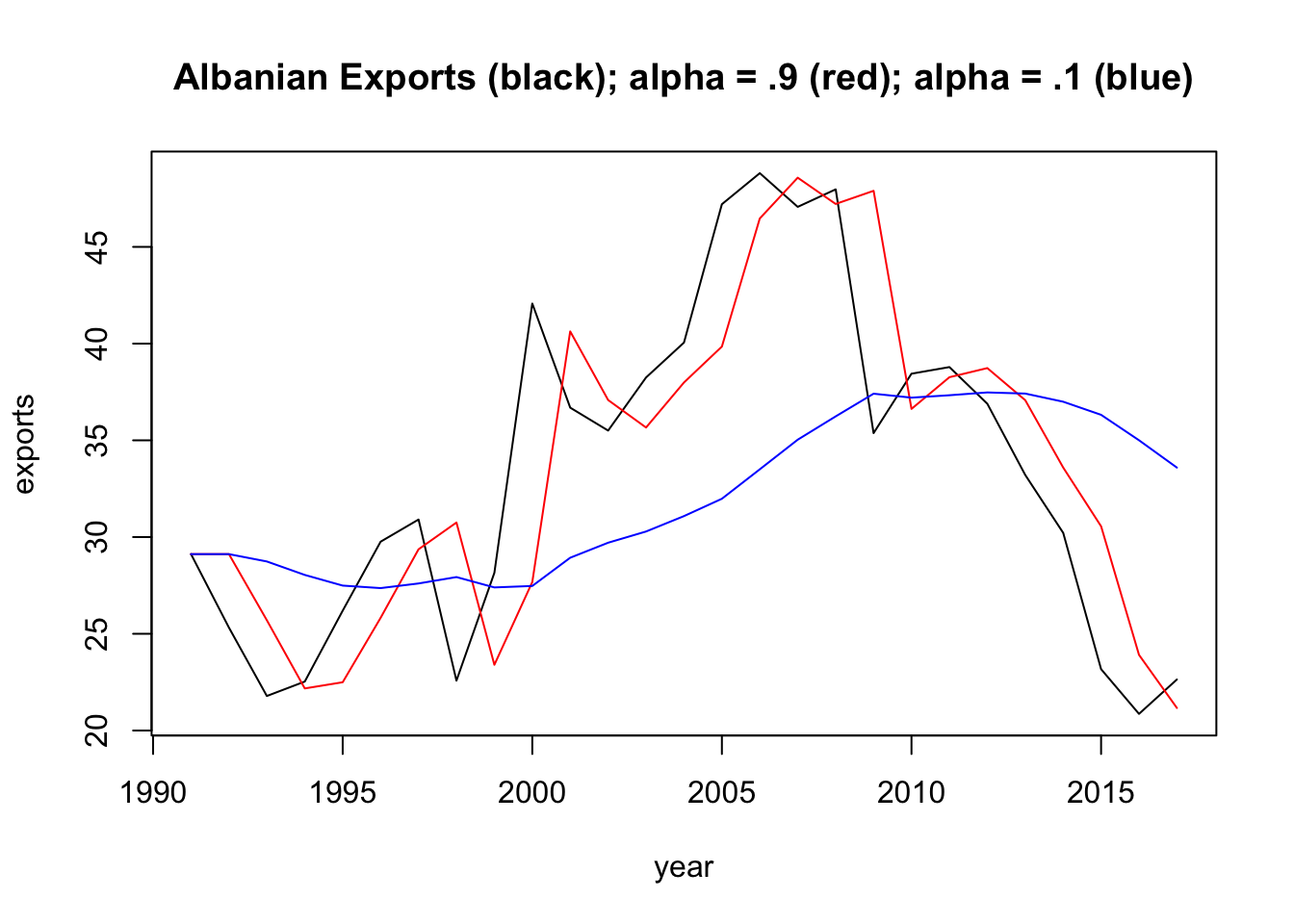 Change the es function we developed in [Exponential Smoothing] to return the SSE, rather than yt, the smoothed time series. Now, use the optim function to find the values of \((\alpha, l_0)\) that minimize SSE. Plot the exponentially smoothed time series of the Albanian export data using the optimized values for \((\alpha, l_0)\). What are these values?